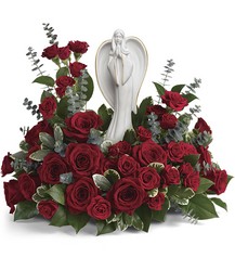 This peaceful porcelain angel sculpture, surrounded by radiant red roses and delicate greenery, is a touching tribute to a rich life.