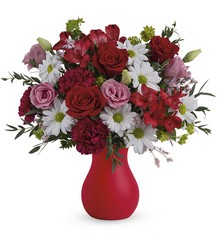 Send a kiss across the miles with this playful pink and red bouquet, presented in a crimson-kissed frosted glass vase.