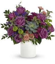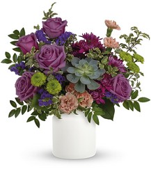 This neutral matte white keepsake lends an organic feel to this extraordinary jewel-toned bouquet of blooms and succulents!