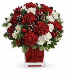 Deliver a winter's day delight. This sweet bouquet includes red carnations and white carnations beautifully arranged in our bright red glass cube. Approx. 11 1/2 W x 12 1/2 H
