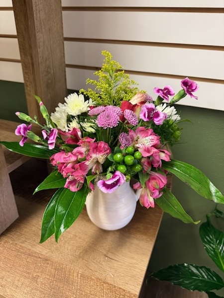 A bright fresh mix of pink and purple flowers arranged in a modern keepsake container. Perfect for brightening up your Valentine's Day. Flowers may vary.