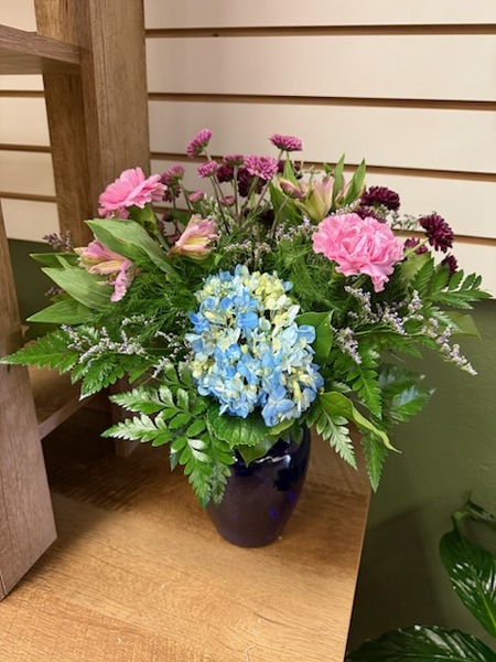 A fresh flower mix of blues, purples, and pinks. Perfect for that Valentine's crush that wants something more than reds and pinks. Flowers may vary.