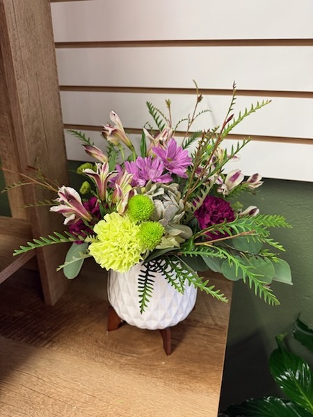 A fresh mix of flowers arranged within a modern container including a succulent. Perfect for your Valentine who loves a modern twist!