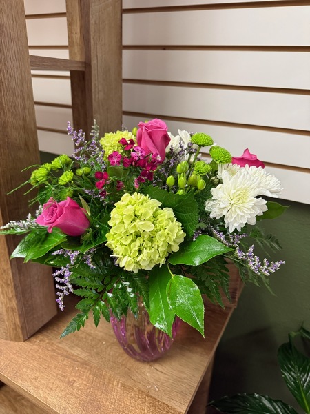 A beautiful arrangement of fresh flowers in bright shades of pinks, purples and greens. Sure to brighten someone's day! Flowers may vary.
